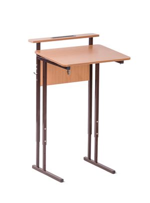Крышка крепится к каркасу винтами М6 через карточные петли и фиксатор наклона, что позволяет устанавливать её на угол от 0 до 19? с фиксацией в нескольких промежуточных положениях с шагом 2-3?. Каркас изготовлен из стального профиля 20х20х1,2 мм и 25х25х1,2 мм, образуя телескопическую конструкцию таким образом, что высоту его можно устанавливать в трёх положениях по высоте (2-4 групп роста), закрепляя восьми винтами М6. Регулировка осуществляется ступенчато, шаг регулировки – 100 мм. Для хранения канцелярских принадлежностей предусмотрена неподвижная горизонтальная полочка со стаканом или лотком. Сбоку на металлокаркасе предусмотрен крючок для хранения личных вещей.