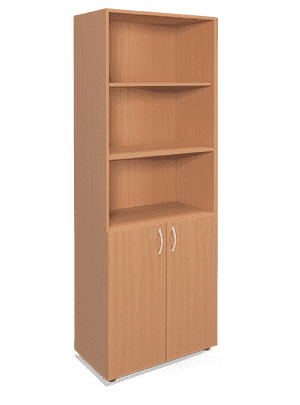 В конструкции стеллажа предусмотрены две жестко закреплённые на евровинты полки, и две съёмные, которые имеют по три положения по высоте с шагом 32 мм. Все полки можно расположить на расстоянии 350 мм друг от друга. Два нижних отдела закрыты дверями из ЛДСП-16 мм. На фасады устанавливаются металлические хромированные ручки 96 мм. Шкаф устанавливается на пластиковые регулируемые опоры М8 для точной установки относительно пола.