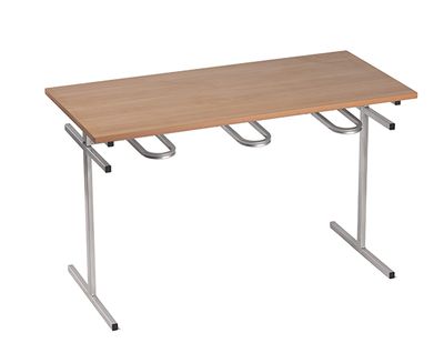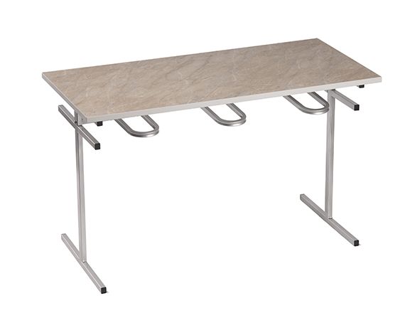 Изделие состоит из столешницы, двух опор и перемычки. Может дополнительно комплектоваться подвесами для табуретов. Столешница изготовлена из ЛДСП толщиной 22 мм, может быть покрыта химовлагостойким пластиком. Края столешницы облицованы ударопрочной кромкой ПВХ-2,0 мм.