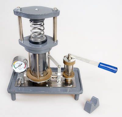 На станине с резервуаром для машинного масла смонтированы рабочий прозрачный цилиндр с большим поршнем, прозрачный корпус с насосом, предохранительным клапаном и манометром. Поршень насоса приводится в движение с помощью съемной рукоядки в виде рычага.