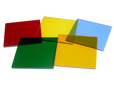 Набор состоит из 5 прозрачных пластин красного, оранжевого, желтого, зеленого и синего цвета, уложенных в коробку. Размеры пластин 50*50 мм.