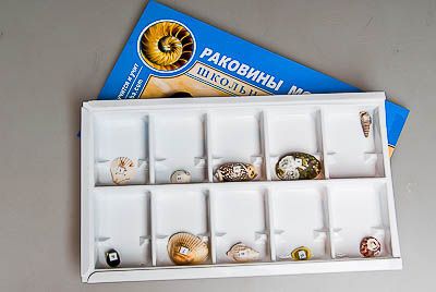 Коллекция включает образцы раковин двустворчатых и брюхоногих моллюсков. Объекты пронумерованы соответственно списку и упакованы в коробку с ячейками.
