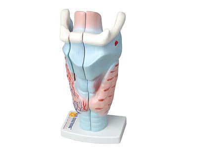 На модели цветом выделены следующие детали строения гортани: 1. Большой рог подъязычной кости. 2. Зерновидный хрящ. 3. Щитоподъязычная мембрана. 4. Верхний рог щитовидного хряща. 5. Складка преддверия. 6. Желудочек гортани. 7. Голосовая складка. 8. Перстнечерпаловидный сустав. 9. Подголосовая полость. 10. Пластинка перстневидного хряща. 11. Задняя перстнечерпаловидная мышца. 12. Черпаловидный хрящ. 13. Рожковидный хрящ. 14. Преддверие гортани. 15. Латеральная щитоподъязычная связка. 16. Надгортанник.