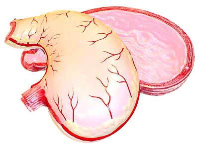 На модели цветом выделены следующие детали строения желудка: 1. Пищевод. 2. Дно желудка. 3. Большая кривизна. 4. Привратниковая часть. 5. Отверстие привратника. 6. Сфинктер привратника. 7. Складки слизистой оболочки. 8. Малая кривизна. 9. Тело желудка.