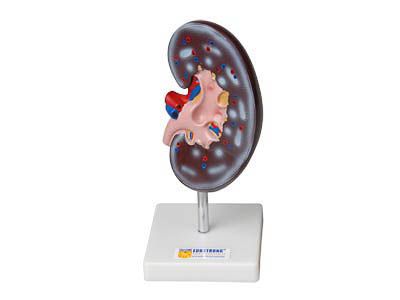 Модель демонстрирует внешнее строение почки человека и ее сагиттальный разрез. Модель окрашена в естественные цвета. На модели представлены следующие элементы строения почки человека: 1. Капсула почки. 2. Корковый слой почки. 3. Большая почечная чашечка. 4. Мозговое вещество (пирамиды). 5. Мочеточник. 6. Почечная лоханка. 7. Почечная вена. 8. Почечная артерия.