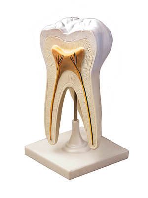 На модели представлены следующие детали строения: коронка зуба, шейка зуба, корень зуба, зубная эмаль, зубная кость (дентин), зубная пульпа, нервы и кровеносные сосуды.