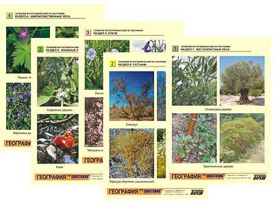 В комплект входят 32 листа с описаниями по разделам: "Арктические пустыни. Тундры", "Хвойные леса. Широколиственные леса", "Степи. Пустыни", "Жестколистные леса. Саванны. Влажные тропические леса".