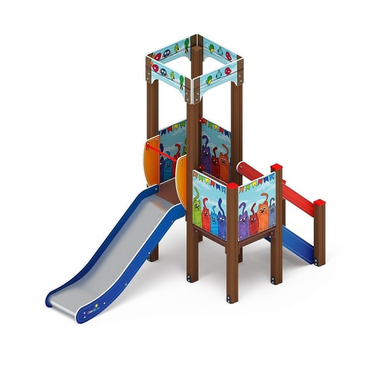 Башня с горкой выполнена из четырёх клеёных брусьев, окрашенных в коричневый цвет, 100х100 мм высота 2500 мм пол из ламинированной фанеры, с антискользящим покрытием 780х780 мм, толщиной 18 мм без крыши, украшена стилизованными декоративными арками, кромки фанеры тщательно шлифованы, арки окрашены с нанесением рисунка - птички, разных цветов и размеров, на фоне голубого неба -. Отметка пола башни с горкой от планировочной отм площадки 900 мм. Башня с лестницей примыкает к башне с горкой, выполнена из двух клеёных брусьев, окрашенных в коричневый цвет, 100х100 мм высота 1500 мм пол из ламинированной фанеры, с антискользящим покрытием 780х780 мм, толщиной 18 мм без крыши. Отметка пола башни от планировочной отм площадки 750 мм