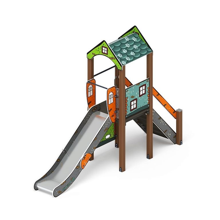 Скат горки шириной 530 мм, выполнен из нержавеющей стали t=1,5 мм, - цельного листа, борта выполнены из влагостойкой фанеры толщиной 24 мм, кромки фанеры тщательно шлифованы, борта окрашены при помощи УФ печати, принт - в стиле «Мультяшный город»- основной цвет принта серый с вкраплениями оранжевых кирпичей. Соединительный элемент - оранжевый. Ограждения стартового участка горки, выполнены из влагостойкой фанеры толщиной 18 мм, фанера окрашена - оранжевый принт, имитирует кирпичную стену с арочным окном. Опорный каркас горки выполнен из профиля 40х25 и труб диаметром 32 мм (металл имеет плавные радиусы и тщательную обработку швов, покрыт порошковой краской)