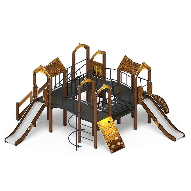 Башни выполнены из четырёх клеёных брусьев 100х100 мм высотой 2500 мм полы из ламинированной фанеры с антискользящим покрытием 1000х1000 мм, толщиной 18 мм. Над двумя башнями имеется двух скатная крыша из фанеры толщиной 12 мм, размер 1000х575 мм. Над двумя другими башнями - арки, разборная конструкция из двух полуарок, габарит 500х342х18 мм и накладки 220х200х18 мм, кромки фанеры тщательно шлифованы, фанера окрашена с нанесением принта - эко. Размер башен 1000х1000х3000 (h)- с крышей и 1000х1000х2800 (h)-с аркой