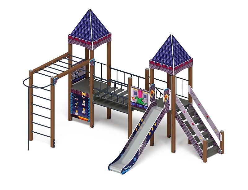 Две башни выполнены из четырёх клеёных брусьев, окрашенных в коричневый цвет, 100х100 мм, высота бруса 3000 мм, пол из ламинированной фанеры, с анти-скользящим покрытием 1000х1000 мм толщиной 18мм. Над башнями имеются четырехскатные крыши из влагостойкой фанеры толщиной 12мм, крыши окрашены с нанесением рисунка, крепятся к аркам из влагостойкой фанеры, толщиной 18мм, арки окрашены с нанесением принта «Пиксель». Отметка пола от планировочной отм. площадки у двух башен 1500 мм.