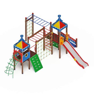 выполнены из четырёх клеёных брусьев, окрашенных в коричневый цвет, 100х100 мм высотой 3000 мм и 2500 мм. Пол из ламинированной фанеры с антискользящим покрытием 1900х1000, толщиной 18 мм. Над башнями имеется четырехскатная крыша из фанеры толщиной 12 мм. Отметка пола башни с горкой +1500 мм. Отметка пола башни с наклонным скалолазом +1200 мм