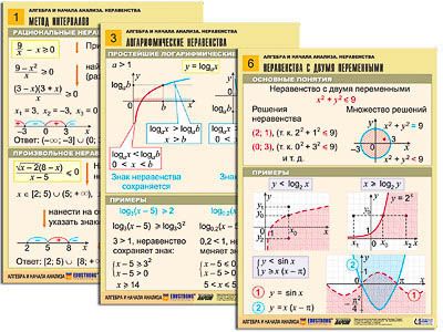 Комплект содержит: 1. Учебное пособие: Н.Б. Мельникова, Г.К. Безрукова. "Алгебра и начала анализа. Неравенства. Методические рекомендации". 2. Комплект учебно-наглядных пособий формата А1 с полноцветной двухсторонней печатью и матовой двухсторонней ламинацией в количестве 6 таблиц: 1. Метод интервалов. 2. Показательные неравенства. 3. Логарифмические неравенства. 4. Тригонометрические неравенства. 5. Графическое решение неравенств. 6. Неравенства с двумя переменными.