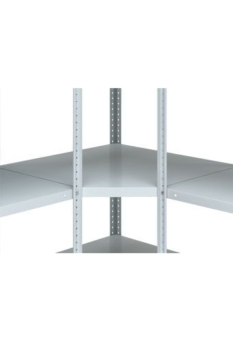 Угловая полка позволяет создать соединение стеллажных секций в углах помещения и собирать стеллажи "уступами", "ступеньками", "углом", "квадратом" и т.д. Угловая полка усилена ребром жесткости, соединяется с секциями стеллажей одинаковой глубины. Допустимая равномерно распределенная нагрузка на одну полку - до 130 кг. Полимерное порошковое покрытие светло-серого цвета (RAL 7035).