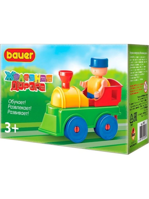 Детали конструктора изготовлены из пластика и безопасного красителя, сочетаются с другими наборами от Bauer. В комплекте: фигурки человечков, сборные машинки различных конфигураций, сборные поезда и вагоны в ним, элементы дорожного полотна, набор инструментов, набор наклеек "Дорожные знаки", элементы декора (дорожные знаки, шлагбаумы, деревья, светофоры, забор, окна, двери, крыши, опоры моста), кубики различных размеров.