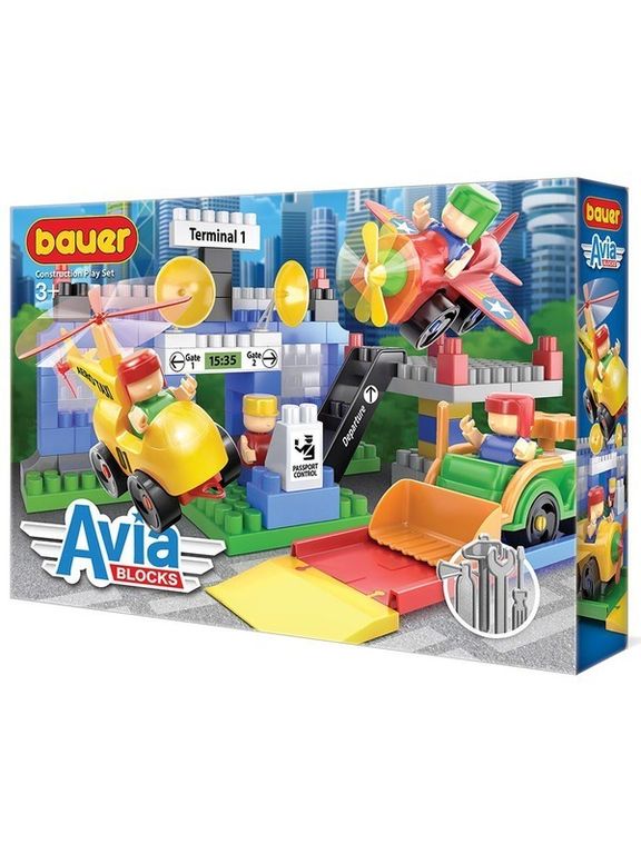 Тематическая серия конструкторов из пластика, посвященная авиации. Из деталей наборов можно построить целый аэропорт со взлетно-посадочными полосами, авиакассами, ремонтным центром и огромным авиапарком. А входящие в комплект наклейки и новые детали делают игру еще интереснее. Наборы предназначены для детей от 3-х лет, сочетаются с наборами других серий от Bauer. В комплекте: разноцветные кубики разных размеров,краны, лестницы, фигурки человечков, элементы декора ,наклейки, радары, заборы, деревья, окна, двери, крыши, сборные машинки и самолеты, набор инструментов, детали для сборки дороги и взлетной полосы.
