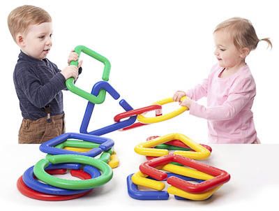 Комплектность: 16 соединяющихся цепочек в форме геометрических фигур (квадрат, треугольник, круг, прямоугольник) в 4 цветах (зеленый, желтый, красный, синий).