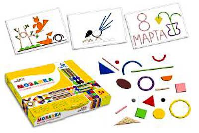 Комплектность: геометрические фигуры - 12 цветов, рабочие поля с цветными схемами мозаичных построек - 15 шт., рабочие поля с черно-белыми контурными схемами мозаичных построек - 15 шт., пеналы - 2 шт., учебное пособие с технологическими картами - 1 шт.?