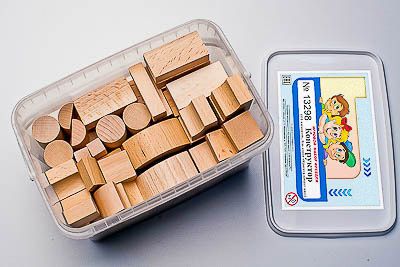 Комплектность: кубики (25*25*25 мм) – 19 шт., цилиндры большие (диаметр 25 мм, высота 50 мм) – 4 шт., цилиндры малые (диаметр 25 мм, высота 25 мм) – 4 шт., параллелепипеды-кирпичики (50*25*12,5 мм) – 16 шт., параллелепипеды-столбики (50*12,5*12,5 мм) – 10 шт., параллелепипеды-полукирпичики (25*25*12,5 мм) – 12 шт., арка большая диаметром 48 мм – 4 шт., арка малая диаметром 24 мм – 4 шт., полуцилиндр диаметром 24 мм – 4 шт., четверть цилиндра (диаметр 24 мм, высота 25 мм) – 4 шт., кубик (25*25*25 мм) с вырезом под четверть цилиндра – 8 шт., призма треугольная большая (35*25*25 мм) – 10 шт., призма треугольная малая (25*17*17 мм) – 12 шт., карточки – 8 шт., руководство по эксплуатации – 1 шт.