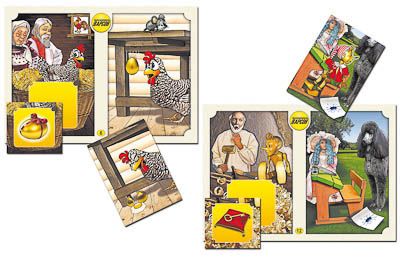 Игра состоит из 12 полноцветных игровых полей формата А5, 12 квадратных и 12 прямоугольных полноцветных карточек. Карточки и игровые поля изготовлены из картона и ламинированы пленкой. Каждое игровое поле посвящено одной из известных сказок. На карточках изображены персонажи и предметы, которые встречаются в этих сказках и оказывают значительное влияние на ход событий в них. Карточки служат продолжением изображений на игровых полях и содержат общие с ними детали фона.