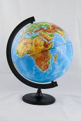 Предназначен для демонстрации при изучении курса географии. Представляет собой модель земного шара с физической картой. Глобус физический дает возможность продемонстрировать расположение на поверхности земного шара материков, океанов, морей, островов, рек, горных вершин, наиболее крупных городов. Условная раскраска карты демонстрирует рельеф суши и дна океанов.