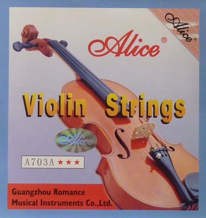 A703A Струны для скрипки. Первая струна - высокоуглеродистая нержавеющая сталь, остальные струны - оплетка из сплава никеля. Упаковка - пластиковый пакет. Alice